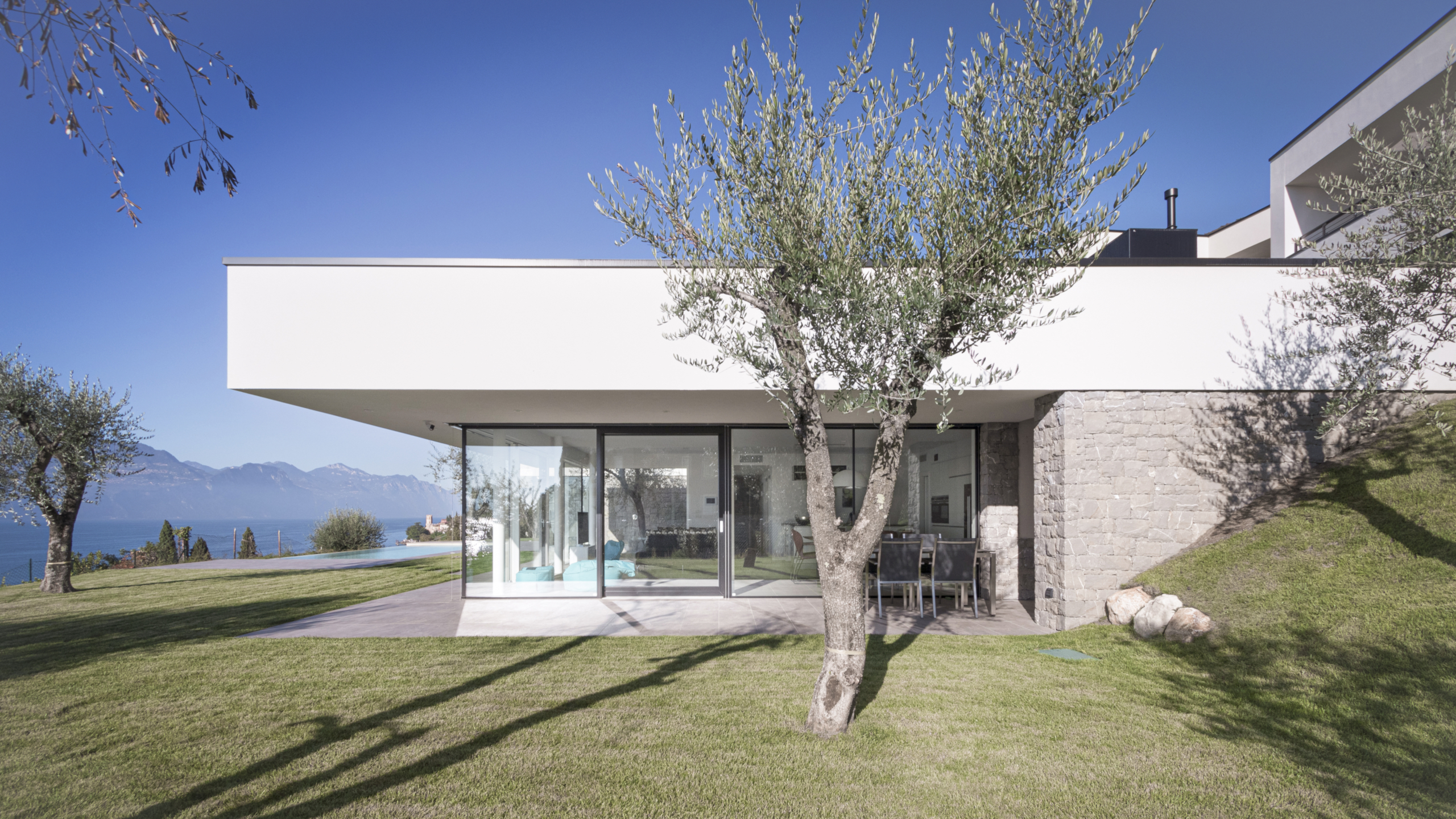 Tre piani di bianco candido emergono dal terreno, incassati a quote diverse per dialogare con la morfologia naturale del luogo. Un’architettura che nasce dal suolo, lo interpreta e lo trasforma in forma abitabile. Le volumetrie vengono ritagliate e sagomate dalle necessità funzionali, definendo linee pure e dinamiche. Le estremità aggettano nel paesaggio come ali di un gabbiano, leggere, tese, pronte al volo. Sotto le superfici sospese si sviluppano gli spazi dell’abitare: ambienti coperti ma permeabili alla luce, pensati per fondersi con l’esterno. Un equilibrio tra protezione e apertura. Il potente paesaggio circostante diventa parte integrante dell’architettura. Penetra negli interni, li avvolge e li completa, rendendo ogni spazio un punto di incontro tra costruzione e natura.